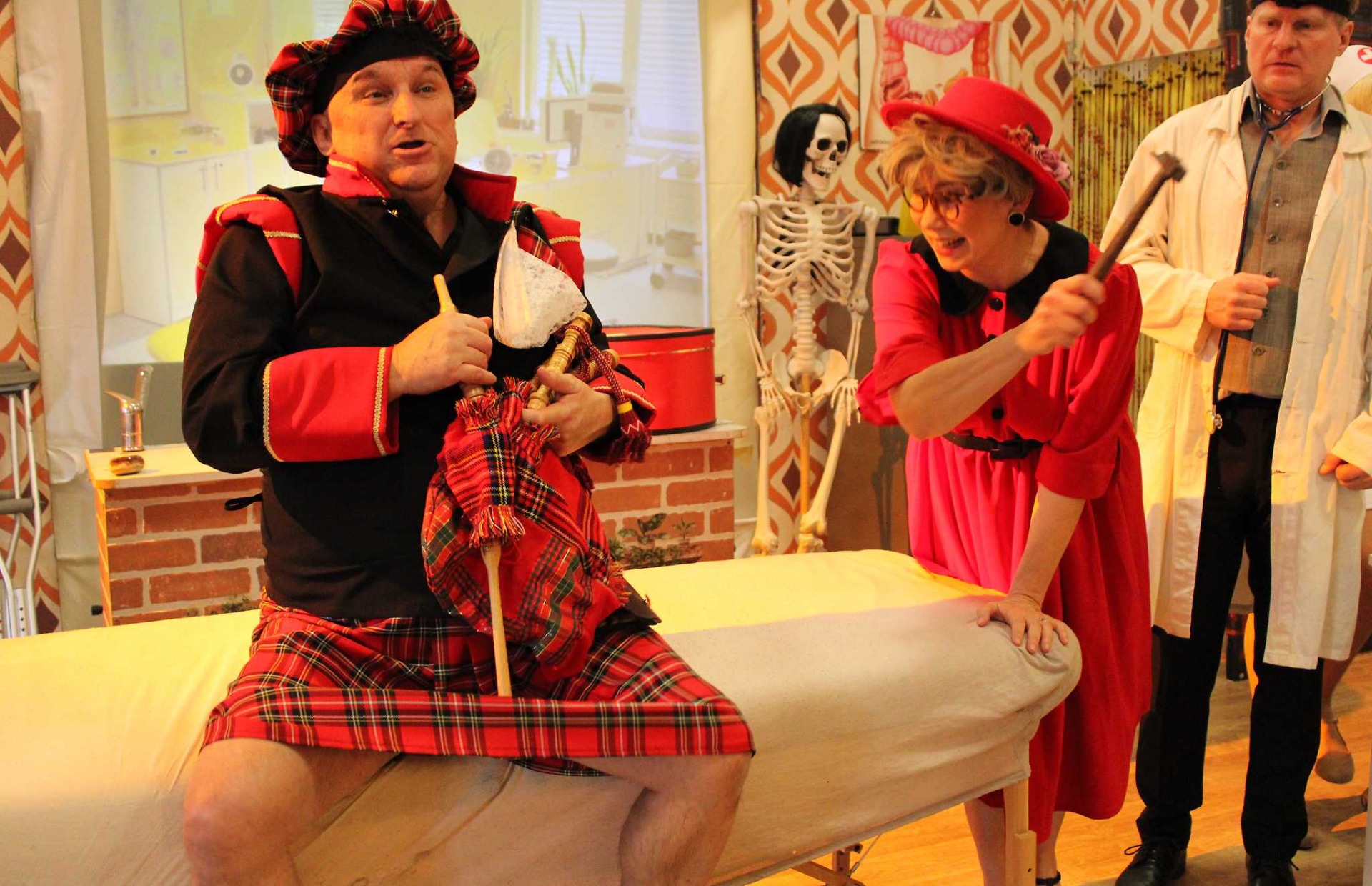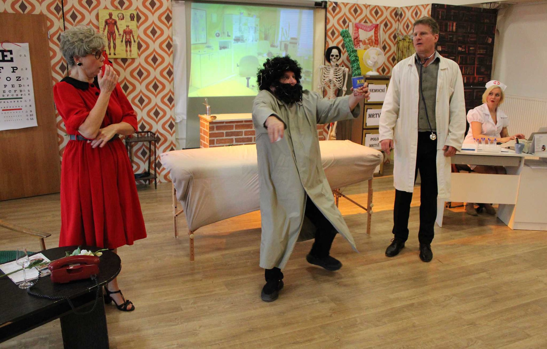 A přesně ten den právě nastal. Nečekaný příjezd energické a nekompromisní matky rozpoutá sérii groteskních situací, neuvěřitelných výmluv a zběsilých improvizací. Roger musí během několika minut vytvořit falešnou ordinaci a spolu se svými přáteli přesvědčit Glorii, že je skutečně váženým doktorem. Zdá se, že plán vychází… Ordinací začnou procházet naprosto originální pacienti, které Roger léčí ještě originálnějšími metodami. Každá návštěva přináší novou dávku absurdního humoru, zmatků a překvapení. Všechno směřuje k velkolepému finále, ve kterém se zdá, že Roger nakonec zvítězí.